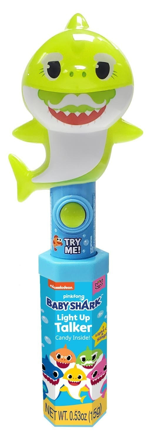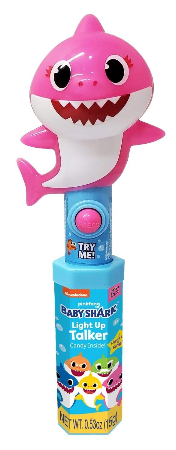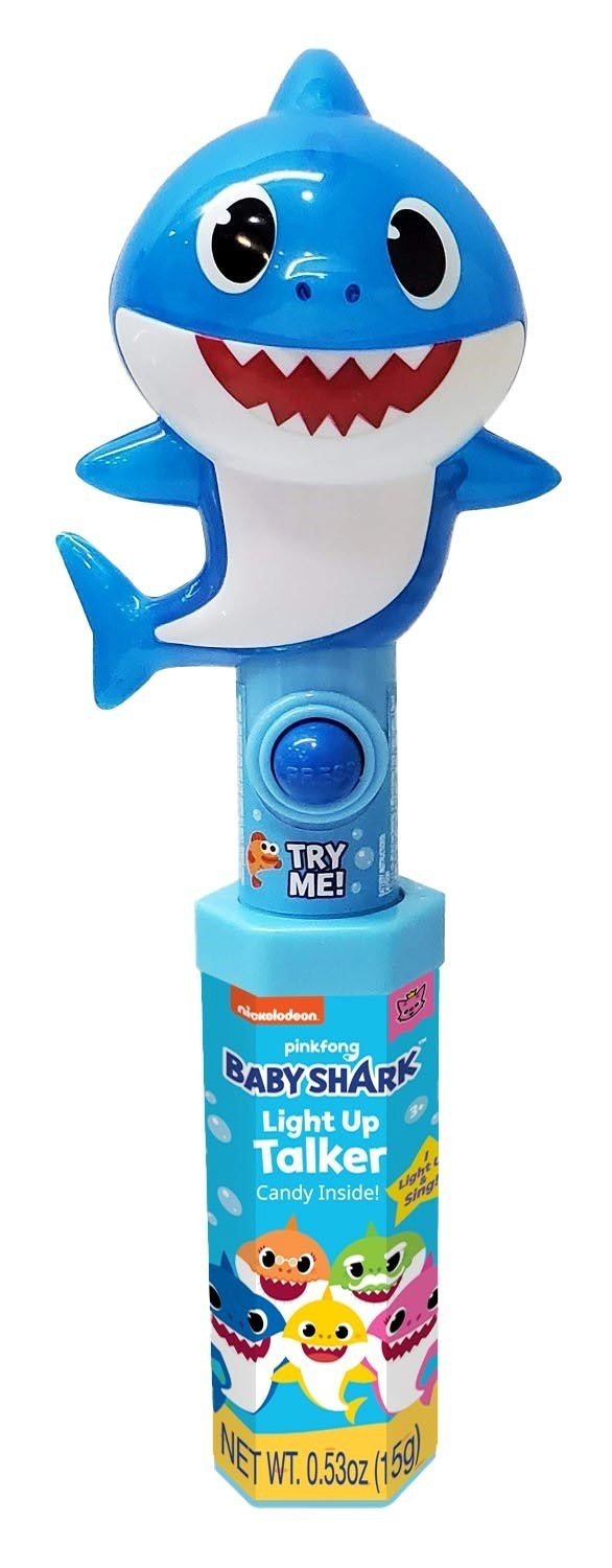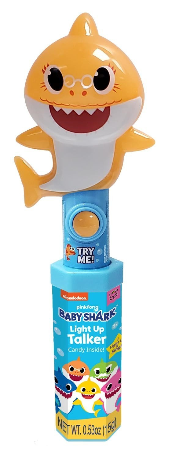 Baby Shark Talker that sings to you! Press the button to hear the Baby Shark song play. Choose from Baby Shark, Mommy Shark, Daddy Shark, Grandpa Shark and Grandma Shark. Includes a packet of of fruit flavored dextrose candy inside.
