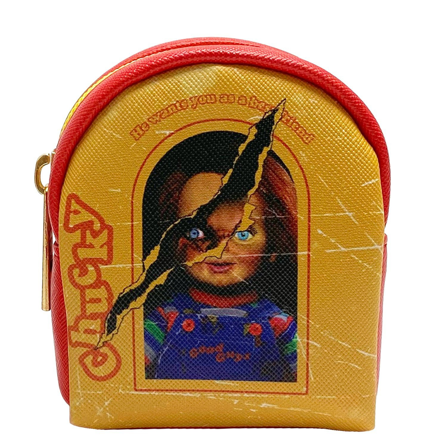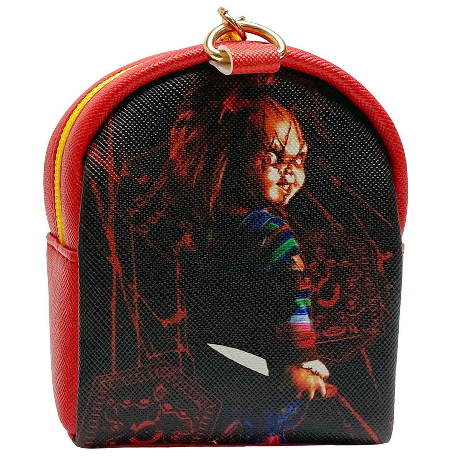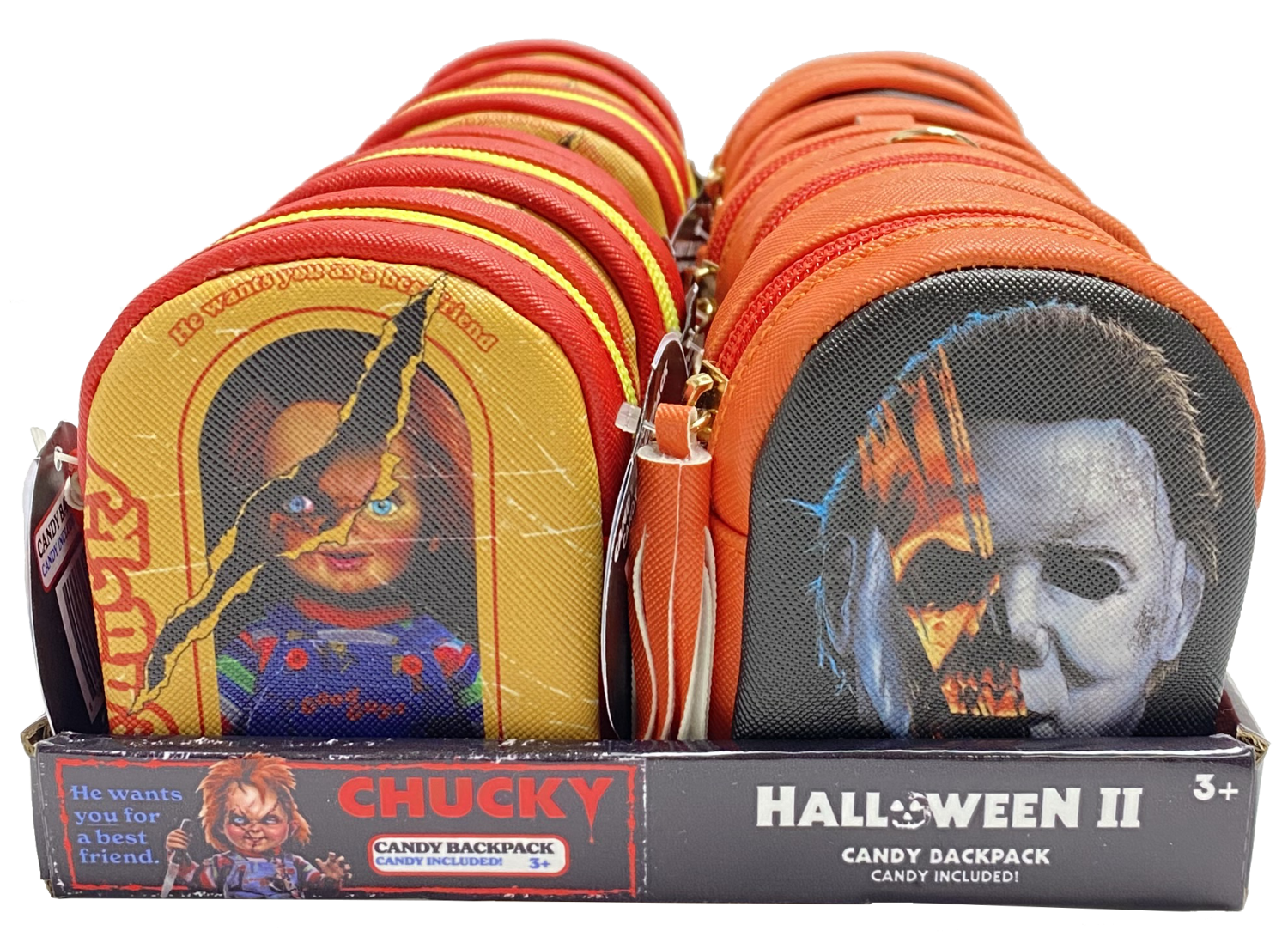 Universal Chucky & Michael Myers Mini Backpacks. Available featuring art for Chucky and Michael Myers. Perfect size to hold just about anything (3.8” x 3” x 1.8”). Each mini backpack comes with both a clip and a key ring plus a colorful tassel on the zipper. The Mini Backpacks include 0.28oz of fruit flavored dextrose candy inside.