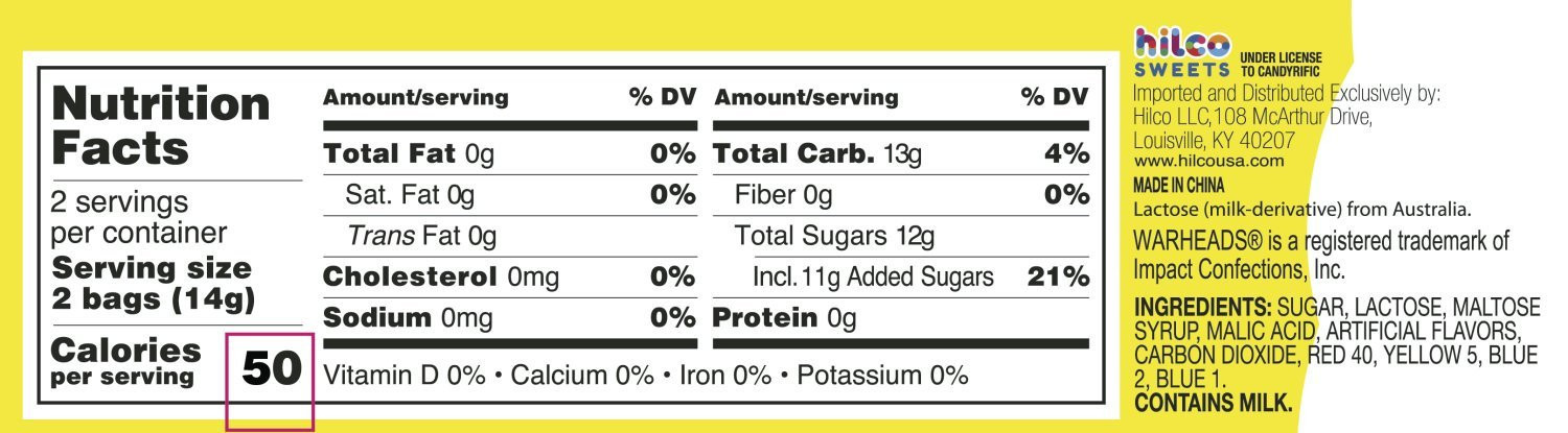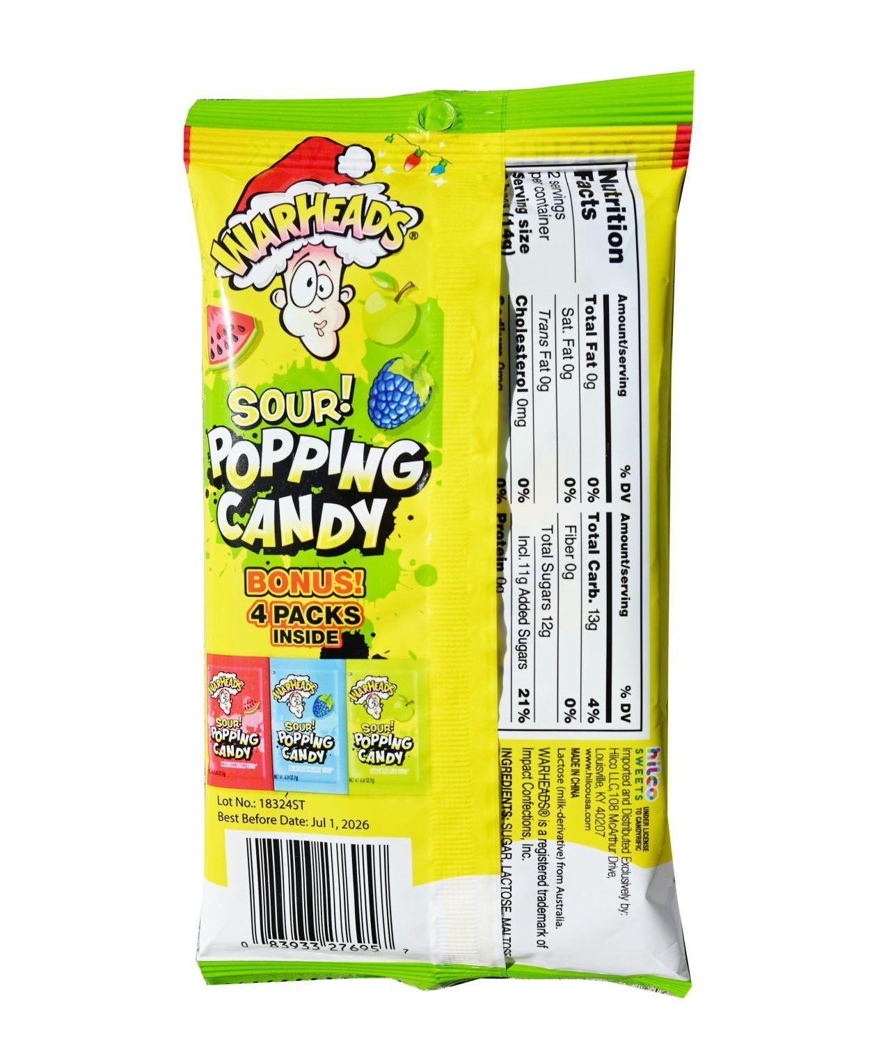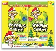 Warheads Christmas 4Pk. Popping Candy Peg Bag .98oz. in top fruity SOUR flavors of Watermelon, Blue Raspberry & Green Apple.