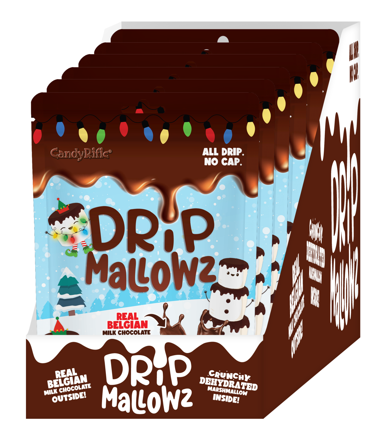 CandyRific Christmas Milk Chocolate Drip Mallowz Bag. This snack transforms soft marshmallows into ultra-crunchy, intensely-flavored treats that melts in your mouth. Each piece is coated in delicious Belgian milk chocolate and will satisfy your sweet tooth.