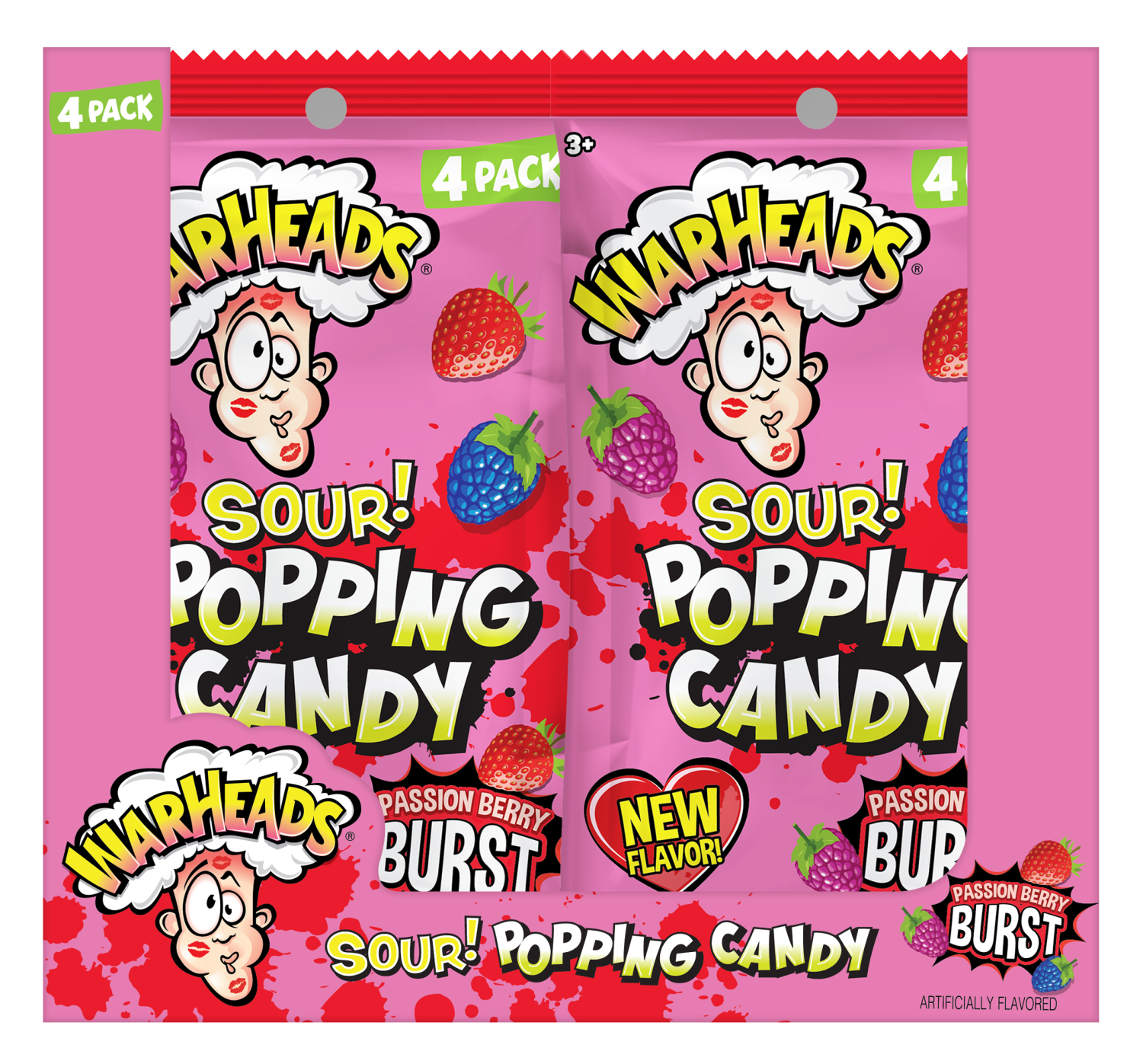 Warheads Valentine Sour 4Pk. Popping Candy Peg Bag 0.74oz. in top flavor of Passion Berry Burst! Perfect as a Sweet & Tart Treat for your Valentine.